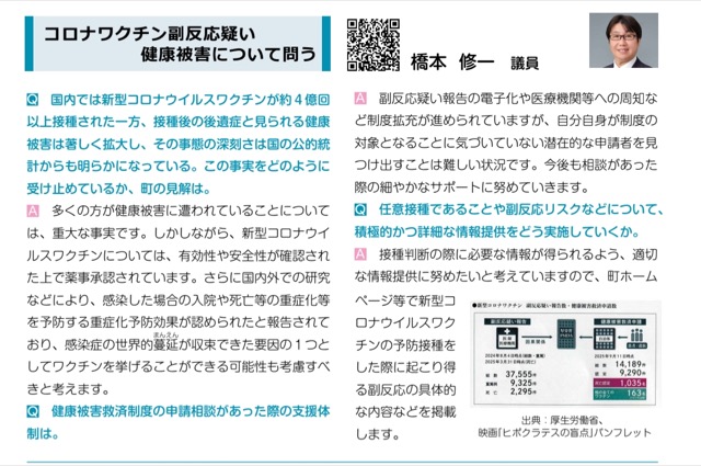 全国で副反応疑いや健康被害の報告が相次ぎ、町民の方々からも切実な声が寄せられています。これまでの行政の取り組みと課題、そして今後の方向性を質しました。