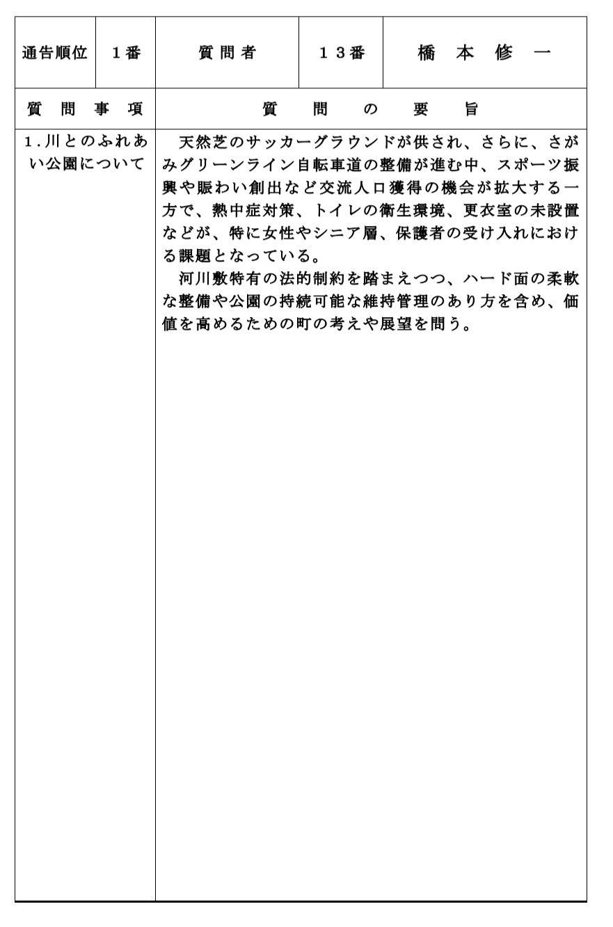 今回のテーマは「川とのふれあい公園について」です。